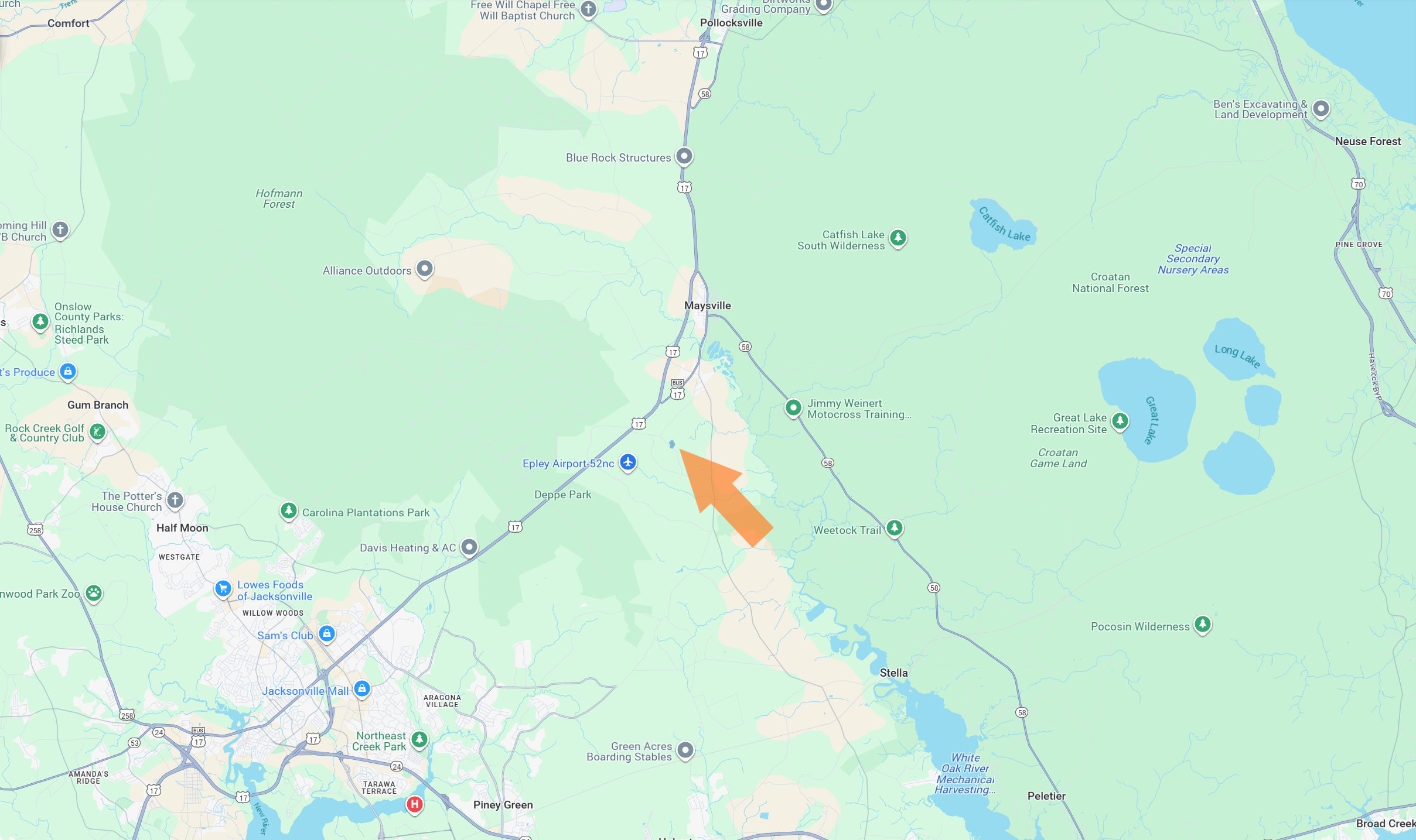 Maysville – 5 Mins. | Jacksonville – 10 Mins. | Swansboro – 20 Mins. | New Bern – 30 Mins. | Wilmington – 1 Hr.